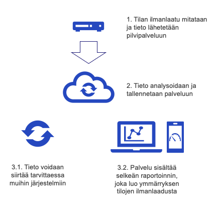 Ilmanlaatua mitataan sensorien avulla. Kerätty tieto tallennetaan pilvipalveluun. Käyttäjien on mahdollista tarkkailla ilmanlaatua raportointikäyttöliittymästä. Tietoa voidaan joustavasti hyödyntää muissa järjestelmissä integraatioiden avulla.