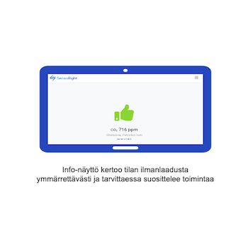 Info-näyttö antaa selkeän kuvan tilan ilmanlaadusta. Tiedon perusteella annetaan myös selkeitä suosituksia ilmanlaatua parantavalle toiminnalle. Suositeltu toiminta voi tarkoittaa esimerkiksi tilan tuulettamista.
